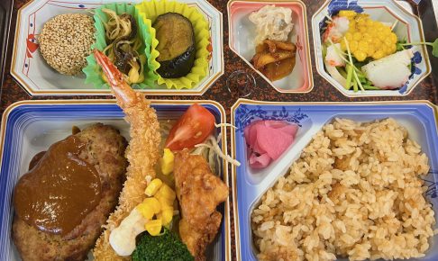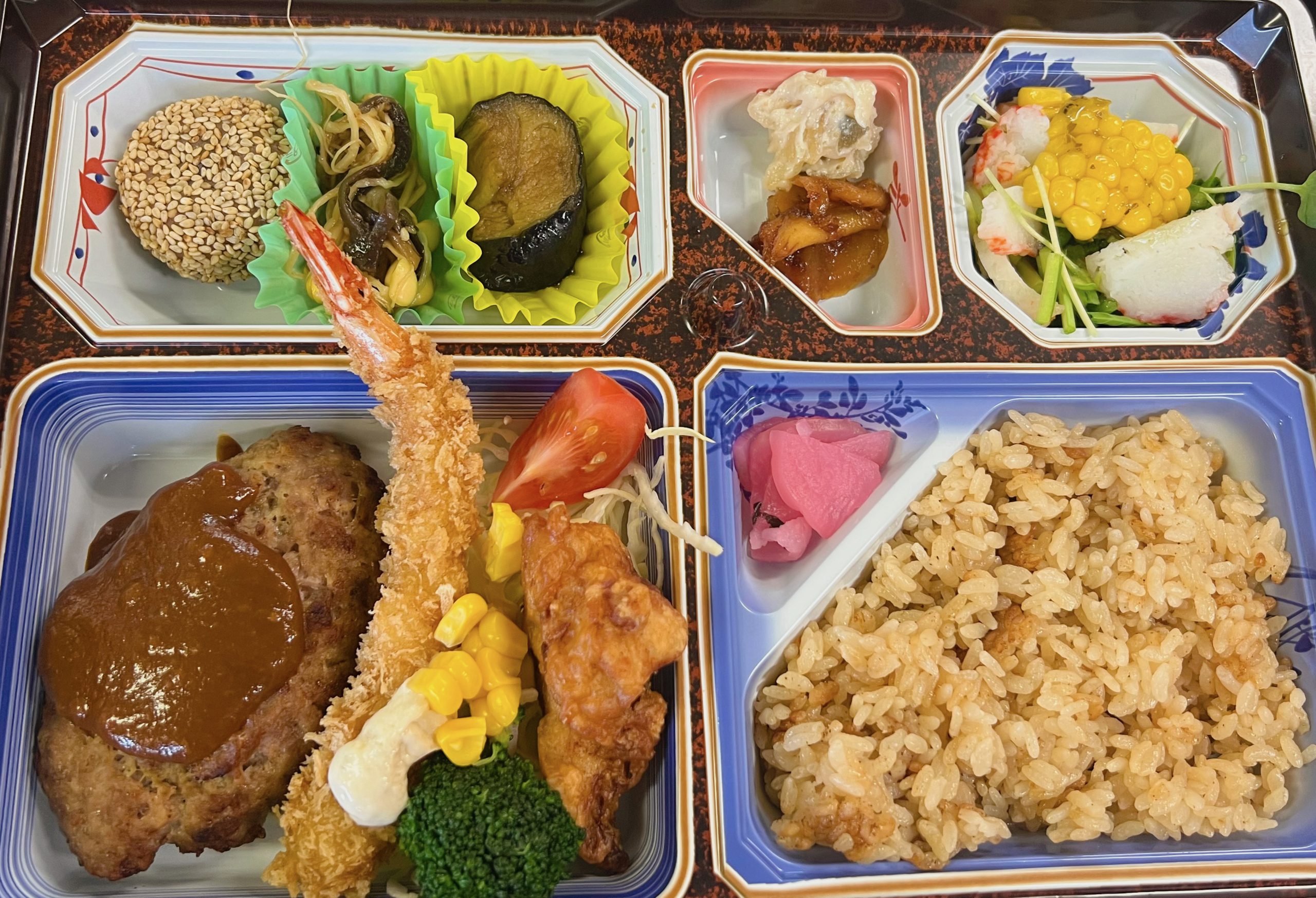 本日はハンバーグ、エビフライ、唐揚げ、ホタテめしを使ったお弁当が朝から入っておりましたょ