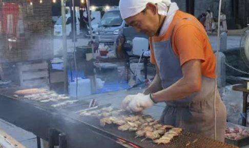 大きな豚串を焼き続ける