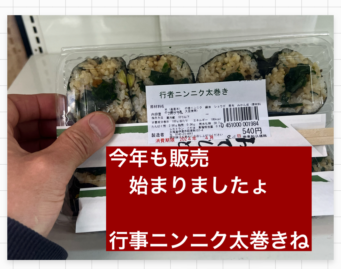 喜び通信2024.04.25 小玉 元司 (げんちゃん)行者ニンニク太巻き ポスト シェア はてブ LINE Pocket春の雨昨晩は風が強かったですね春1番ですかね今年も行者にんにくの季節となりました行事ニンニク スタミナ食材当店ではこのように太巻きにして販売当店では行者ニンニクを食べやすく加工しております。季節商品ですので、期間限定ですょレストランこだまと伊達道の駅物産館でも販売中午後からは雨が弱まるかな? ☺️ この記事が気に入ったら いいねしよう!最新記事をお届けします。この記事が気に入ったら「いいね」してね!シェア大歓迎です♪ ポスト シェア はてブ LINE Pocket feedly北海道産野菜ドレッシングオンラインショップはこちら!黄金豚ハンバーグ、北海道野菜ドレッシング、一度食べて病み付きになり、継続的にご注文いただいております!オンラインショップへ行く