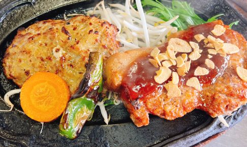ブログ分厚いロース肉をコンガリ焼き上げる トンテキをちょっとアレンジしてみました ガーリックチップを乗せて おろしソースで ハンバーグは デミグラスソースを用いて 150グラム ハンバーグと 200グラム トンテキ ナイフ🍴と…
